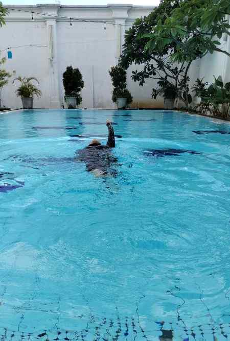 Sesuai dengan rencana, maka sore itu kami menyempatkan memanfaatkan kolam renang hotel untuk berenang sejenak. Sebagai tamu hotel, kami diberi pinjaman handuk untuk dipakai hanya di sekitar kolam renang.