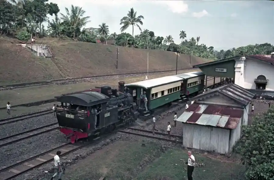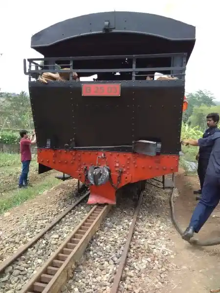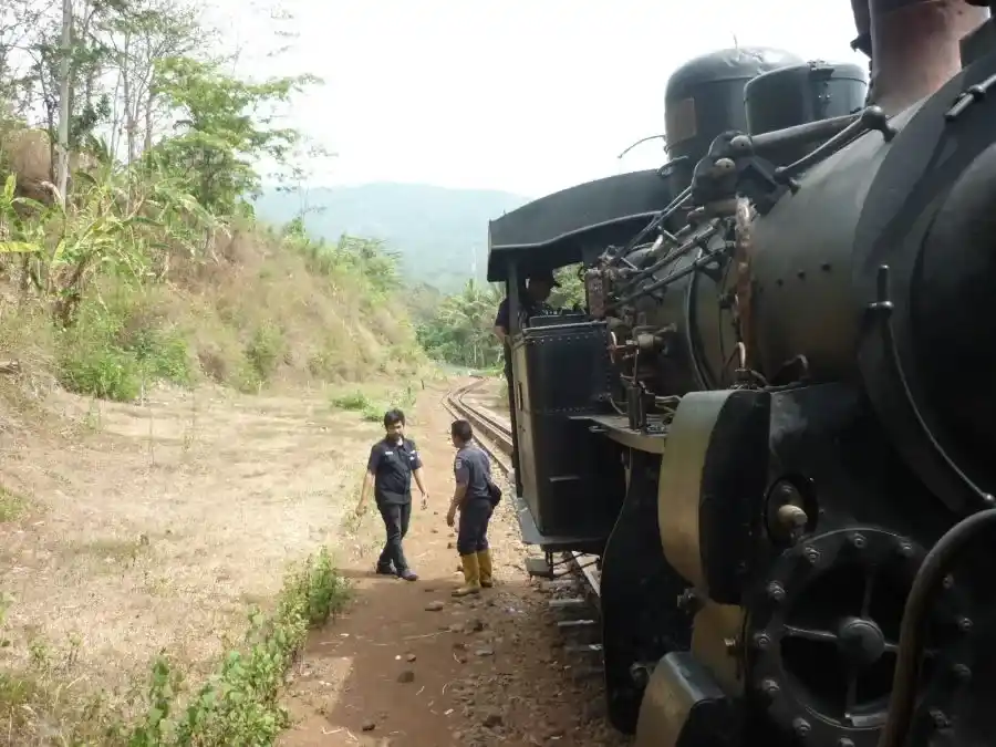 Dari kejauhan dari sisi kiri kami, terlihat lokomotif tiba dengan uapnya yang mengepul-ngepul kehitaman. Adapun bahan bakar untuk menggerakan kereta uap ini harus kayu jati, yang dibakar untuk memanaskan air hingga uapnya mencapai tekanan tertentu, kemudian nantinya mampu menggerakan mesin loko.