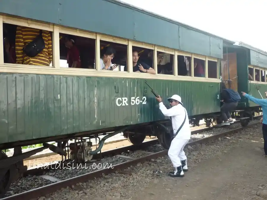 Perjalanan kami didampingi oleh pemandu yang pakai kostum ala-ala Meneer zaman Belanda gitu. Ketika kereta api sempat berhenti, dia pun bergaya pura-pura lagi perang.
