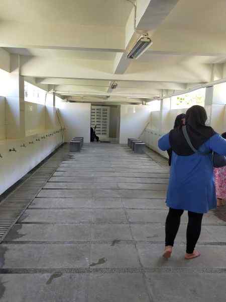 Jadi kami memutar dulu, turun ke bawah, mencari tempat wudhu khusus akhwat. Tempat wudhunya sangat luas dan bersih, di salah satu sisi disiapkan tempat duduk batu untuk memudahkan berwudhu.