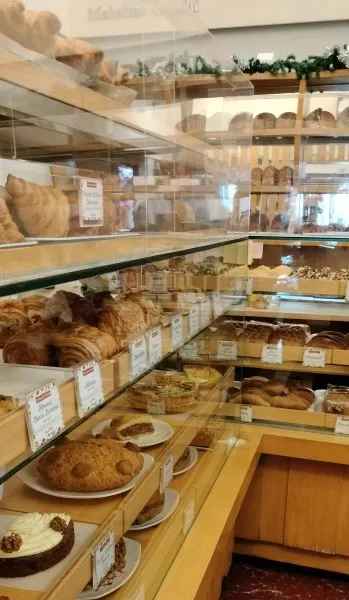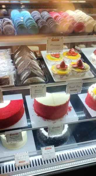 Begitu masuk area pemesanan minuman dan sandwich, kemudian etalase taart dan macaroon. Masuk ke ruangan lebih ke belakang ada lemari etalase berbentuk L. Ada aneka kue-kue, cake dan croissant, baru etalase aneka roti. Mulai dari roti isi, pastry, hingga roti tawar.
