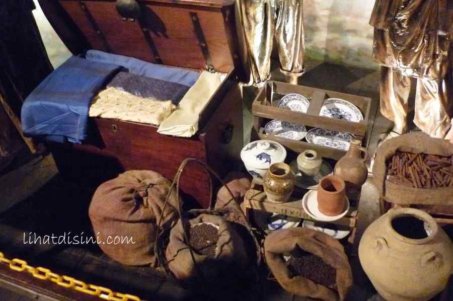 Seperti halnya sebagaian besar museum yang saya kunjungi, di dalam kapal Flor de la mar ini juga menampilkan berbagai diorama, patung, dan replika yang menggambarkan kehidupan para pedagang, pelaut, dan bahkan kondisi tahanan di kapal pada masa lalu.
