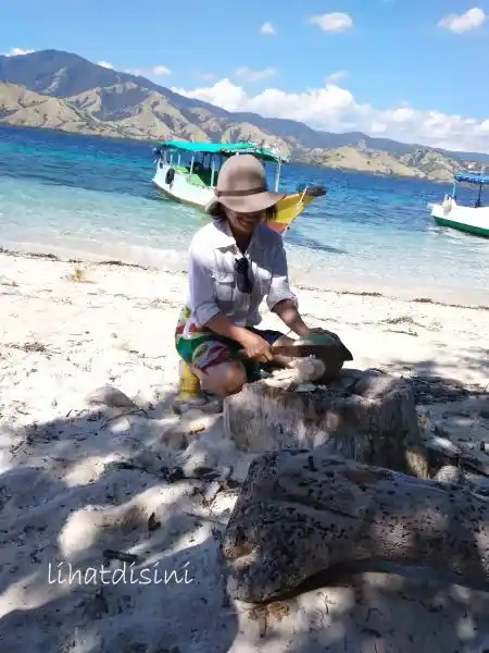 Benar saja, begitu kami merapat, di meja kayu sudah tertata majig jar berisi nasi hangat, lauk pauk asli Flores, seperti Sei Daging, Tumis Pucuk Daun Pepaya, dan yang ditunggu ikan bakar. Aneka ikan, seperti ikan kakap, ikan ayam-ayam, dan ikan kue ukuran besar sedang dibakar, dengan bahan bakarnya sabut kelapa.